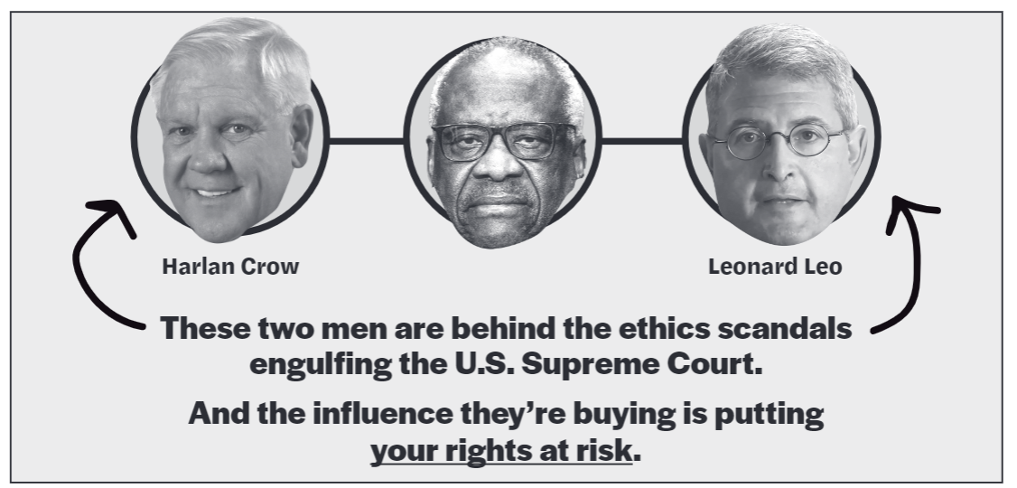 Crow, meanwhile, is the billionaire who keeps Justice Clarence Thomas and his wife, ultra-conservative operative Ginni Thomas, happy with yacht trips, private jets, and luxury vacations. He even bought a house for Justice Thomas' mother and paid tuition for his grandnephew!